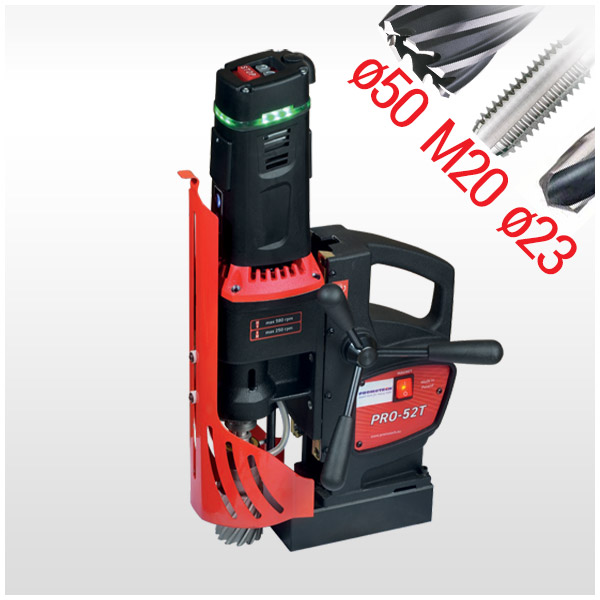 A nagy teljesítményű, állítható sebességű motor akár Ø50 mm-es magfúró és Ø23 mm-es csigafúró használatát is lehetővé teszi. A Promotech új menetfúró rendszerével a gép változtatható irányú főorsójával akár az M20-as méretű menetfúrás is tökéletesen elvégezhető.